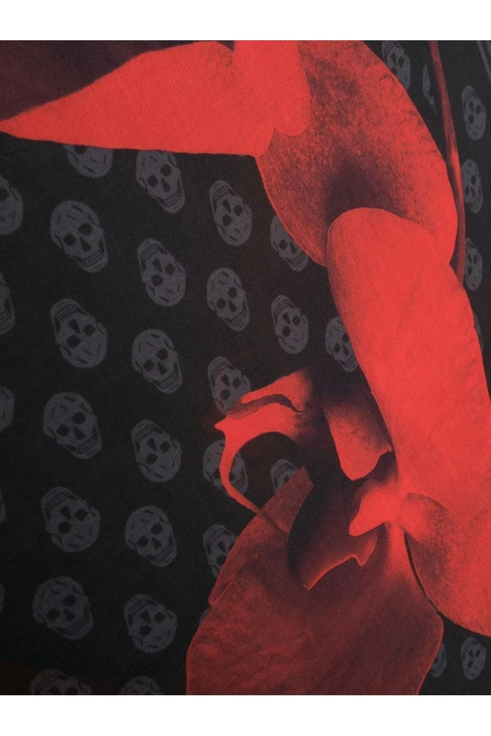 Combining the brand’s signature gothic and romantic influences, this square scarf from Alexander McQueen features the signature skull motif and a large floral print