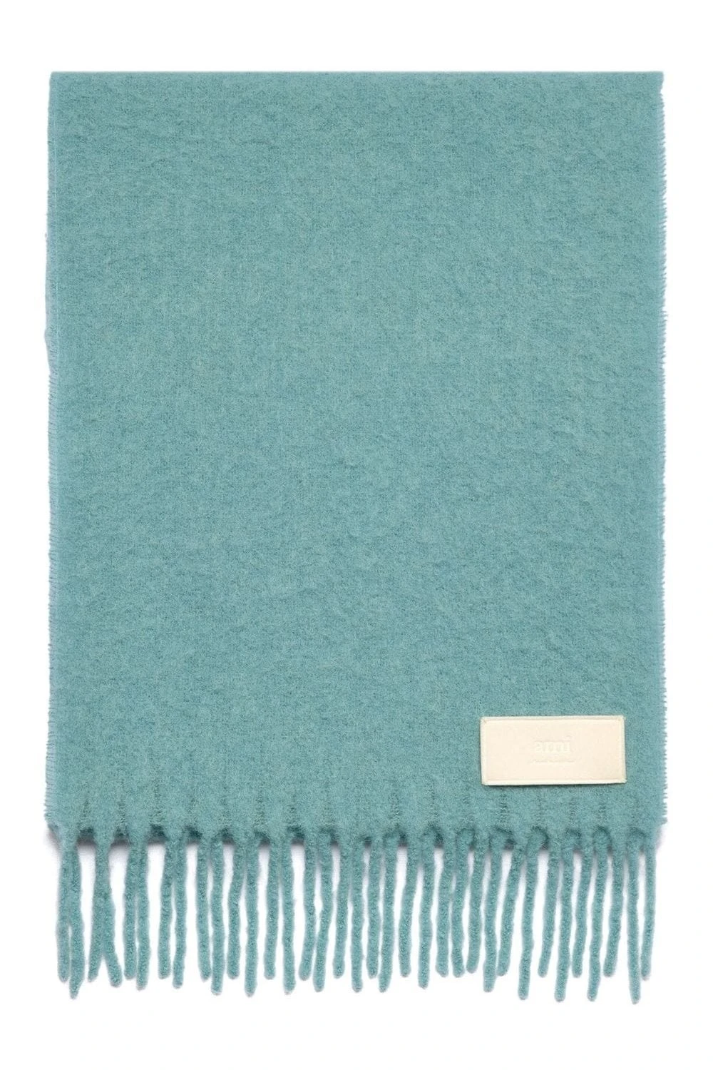 Fringed alpaca-wool scarf brought to you by AMI Paris. This classic scarf in teal blue features a fringed edge, adjustable fit and a logo patch to the side