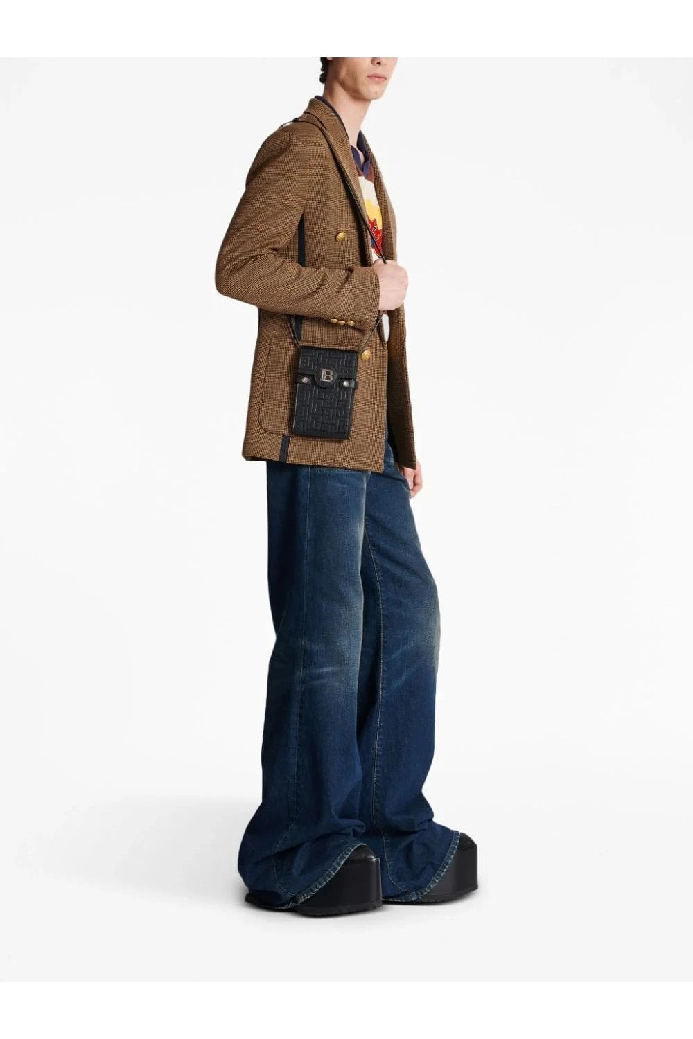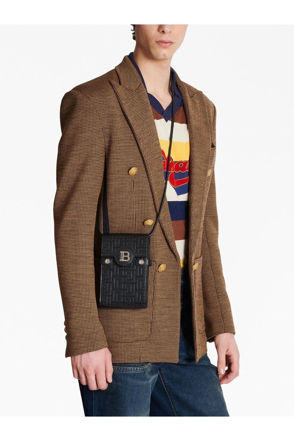 This B-Buzz smartphone holder is brimming with Balmain signatures. It’s crafted from black leather, embossed with the house’s PB monogram and topped with the B-shaped logo plaque at the front. The slip back pocket and detachable shoulder strap make for practical elements