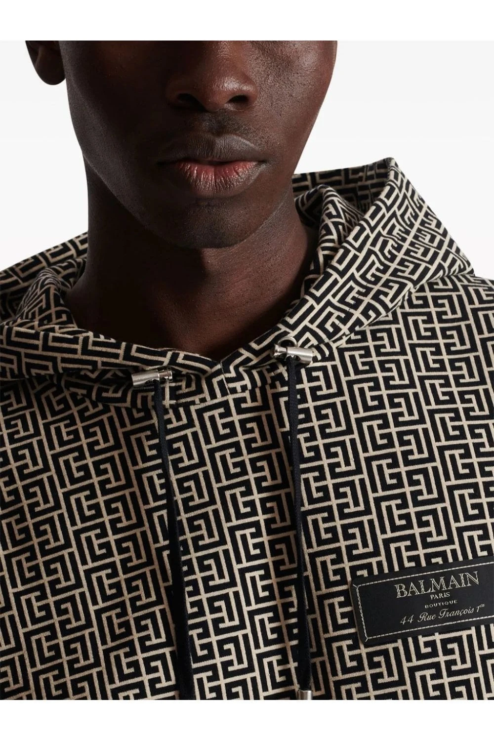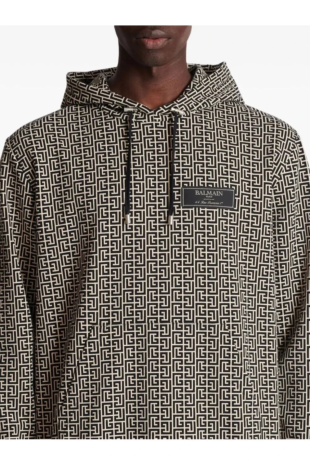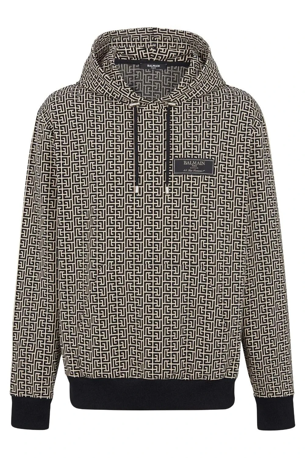 Brought to you by Balmain this logo-applique hoodie features long sleeves, a drawstring hood, front pouch pocket and a straight hem. Finished off with the monogram jacquard and a woven Balmain logo label