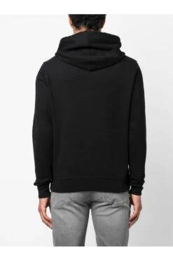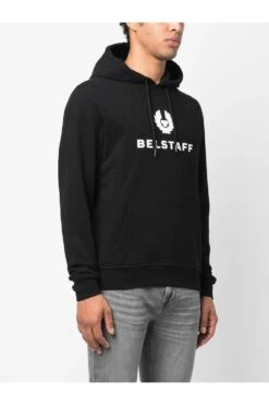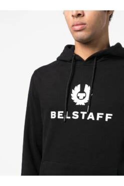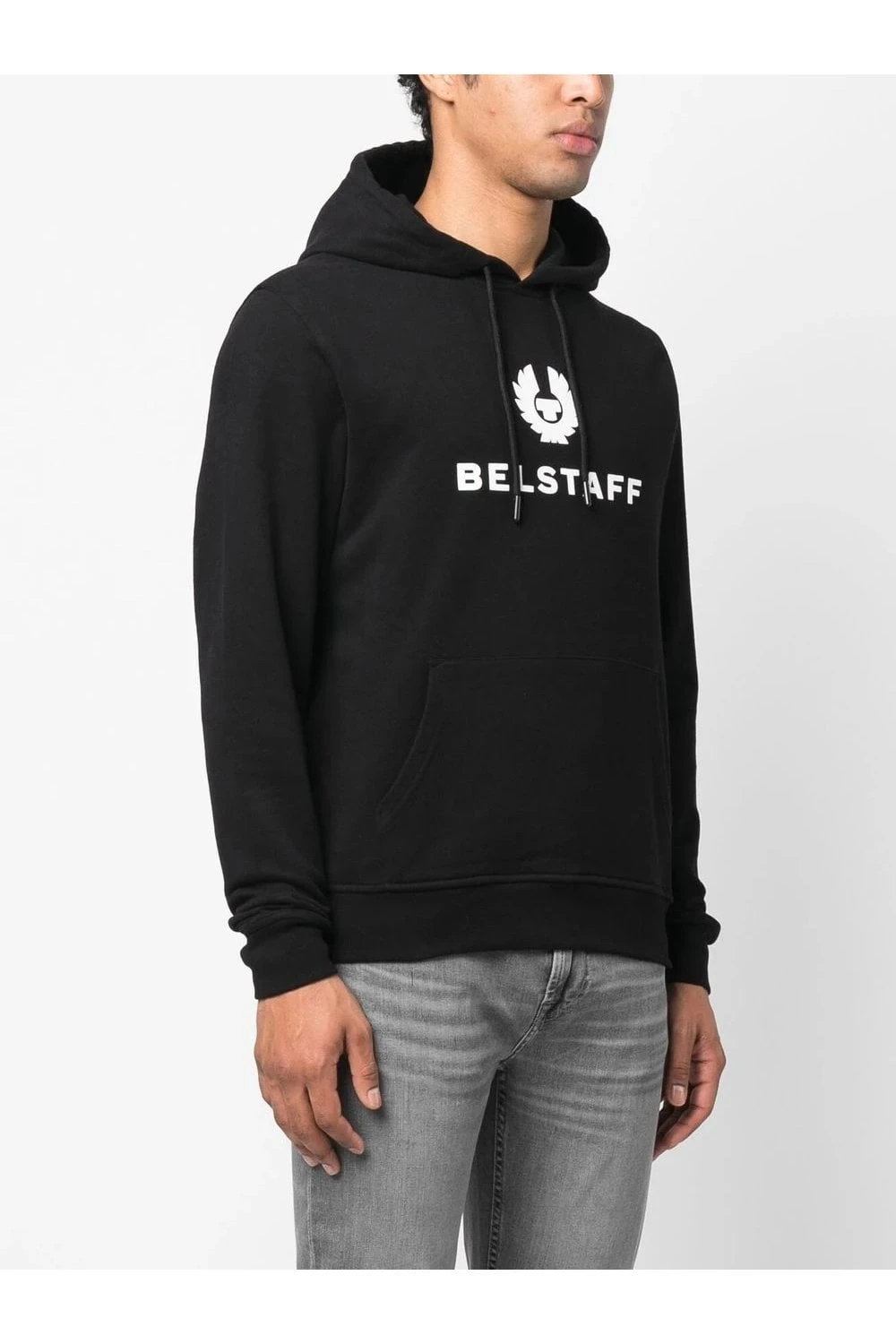 Raised-logo pullover hoodie from BELSTAFF featuring black/white, cotton, raised logo detail, drawstring hood, long sleeves, ribbed cuffs, front pouch pocket and ribbed hem