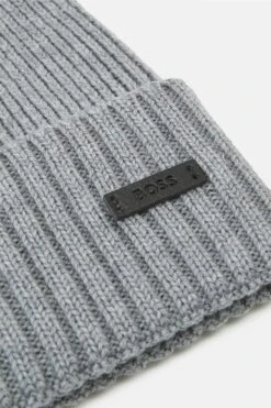 A cosy beanie hat by BOSS, knitted with all-over ribbing and trimmed with a logo plaque in faux leather. This product is made with responsibly sourced and certified wool
