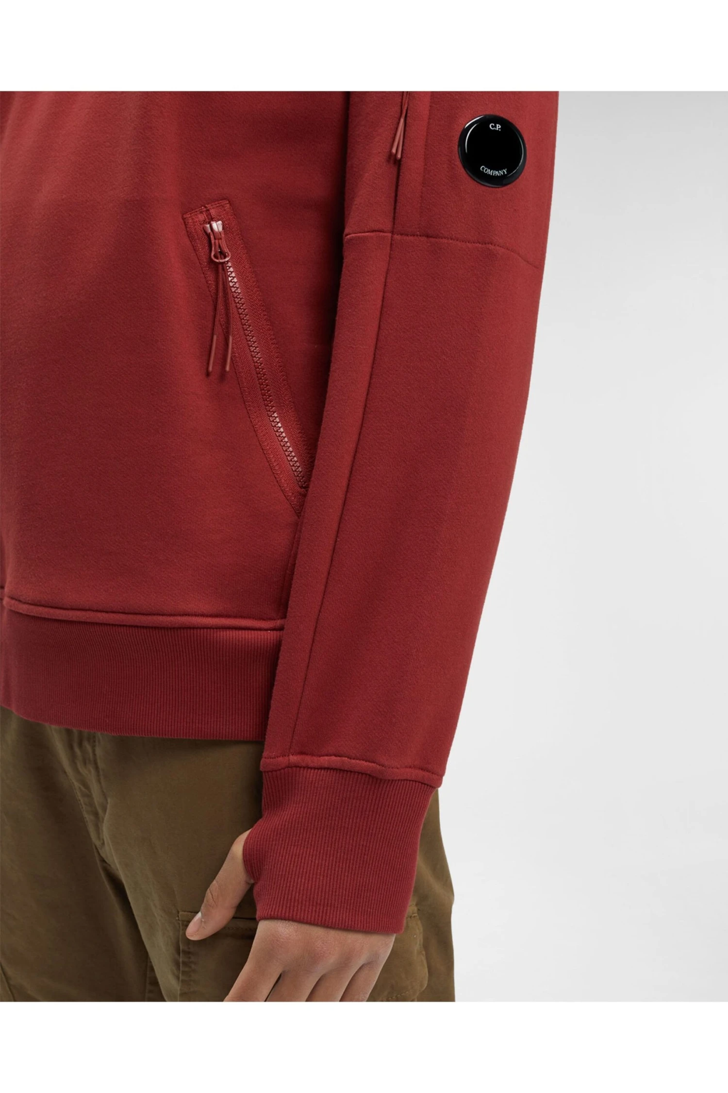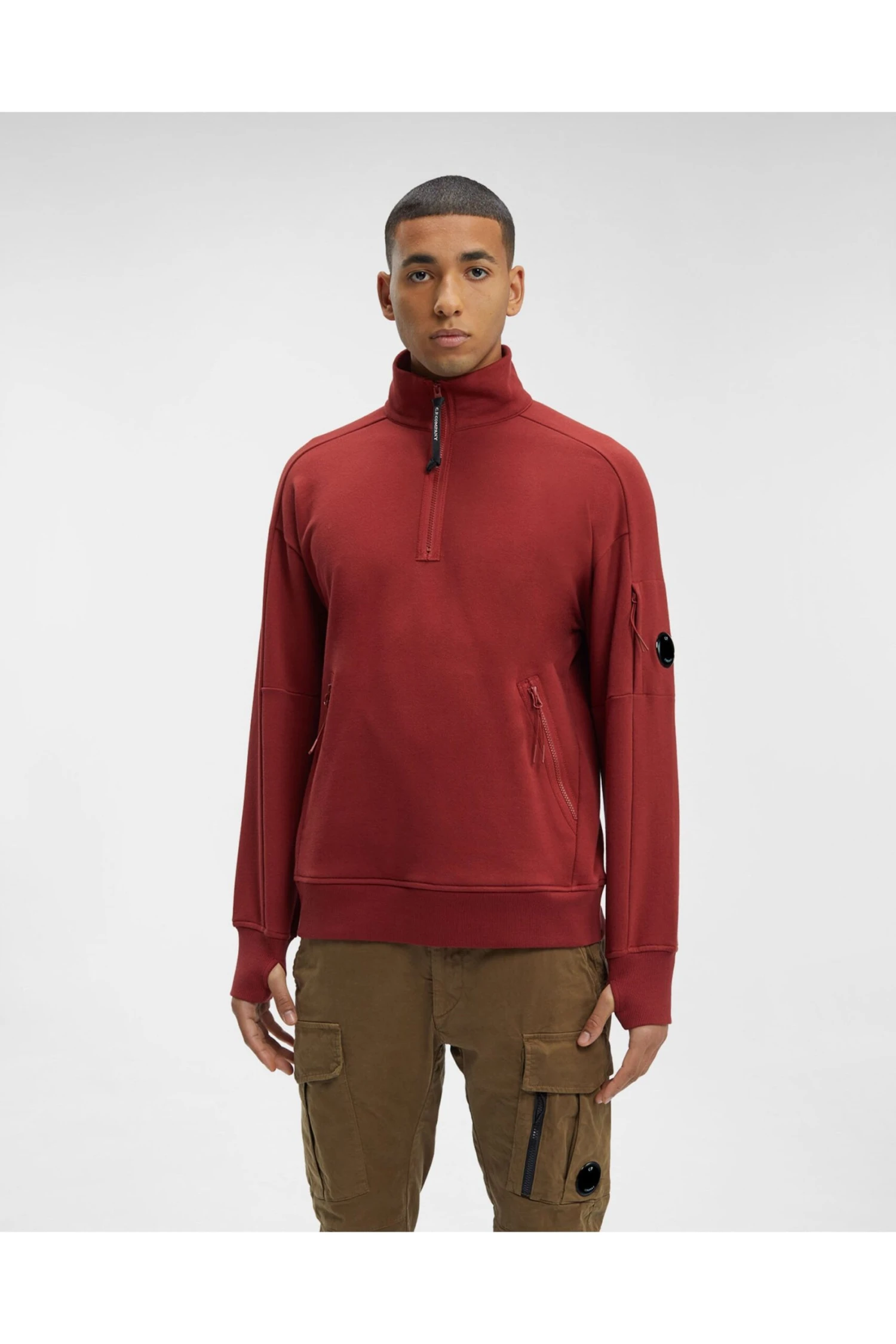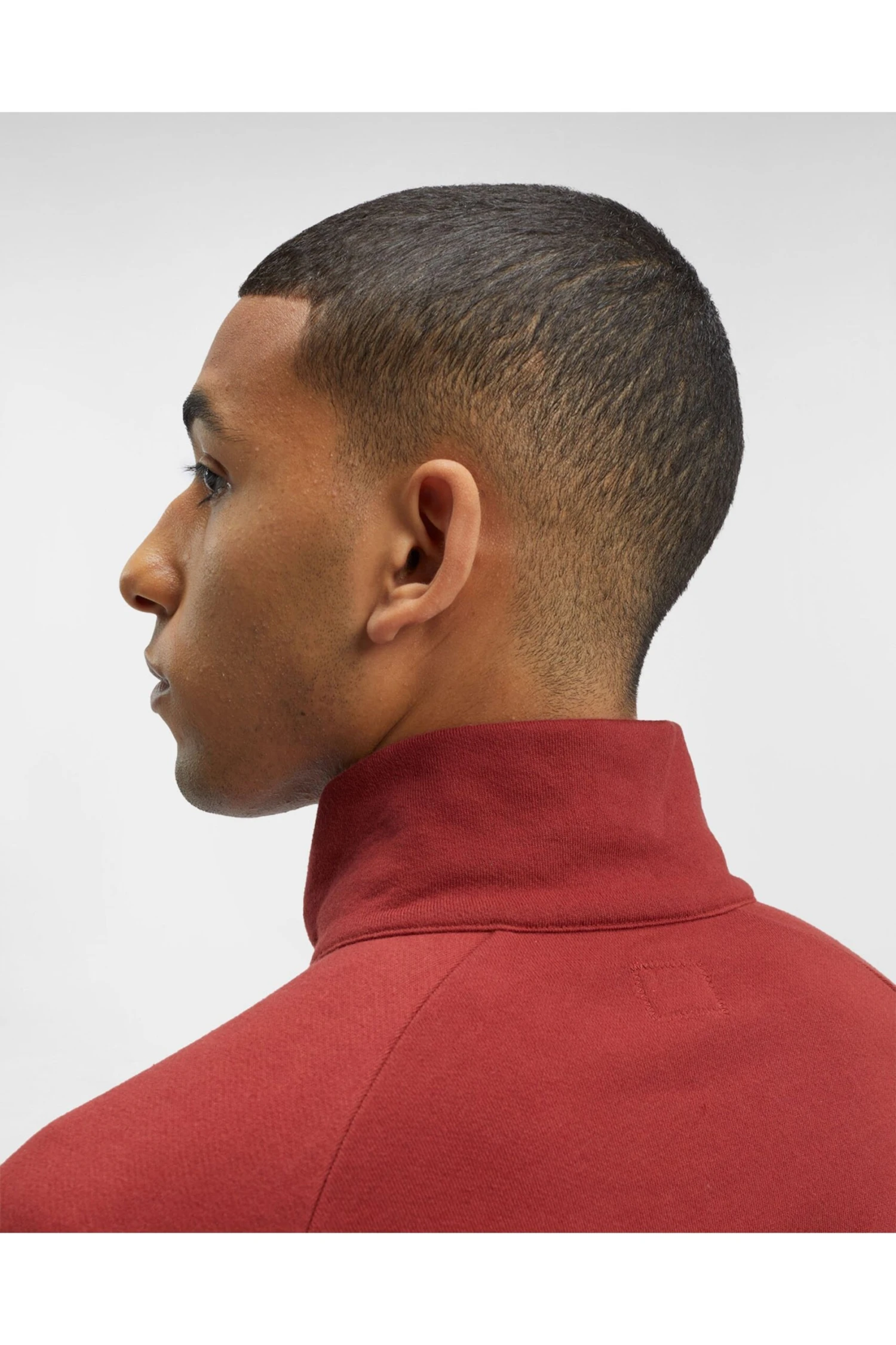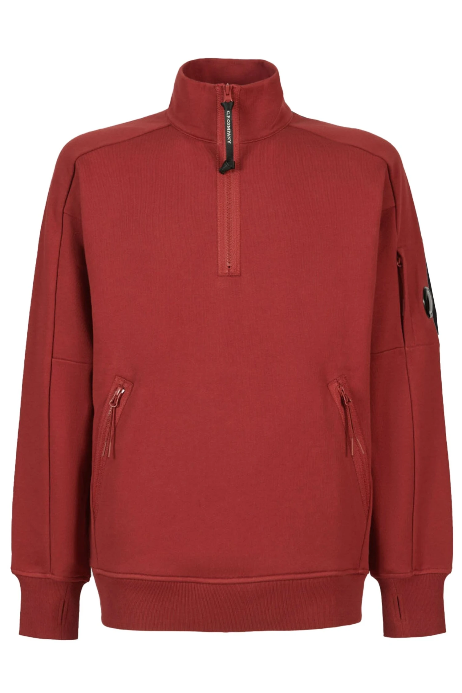 C.P. Company jersey-fleece jumper in red featuring a a half front zip fastening, stand-up collar, long sleeves and sleeve zip pocket with the signature lens