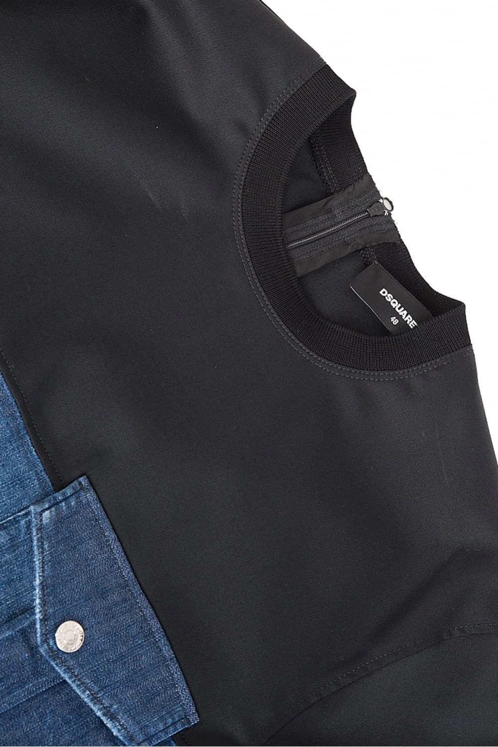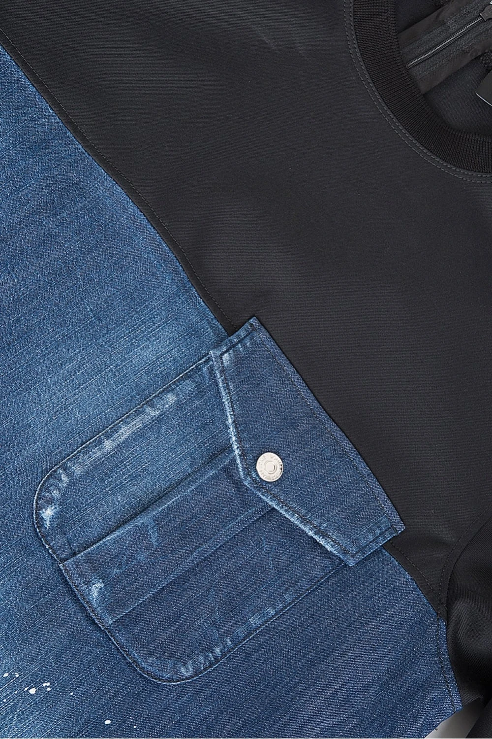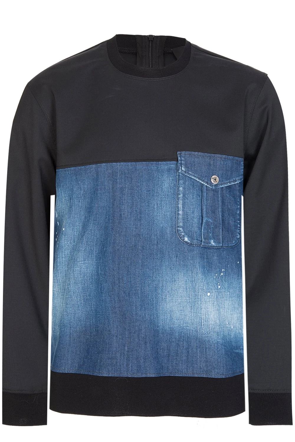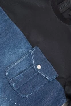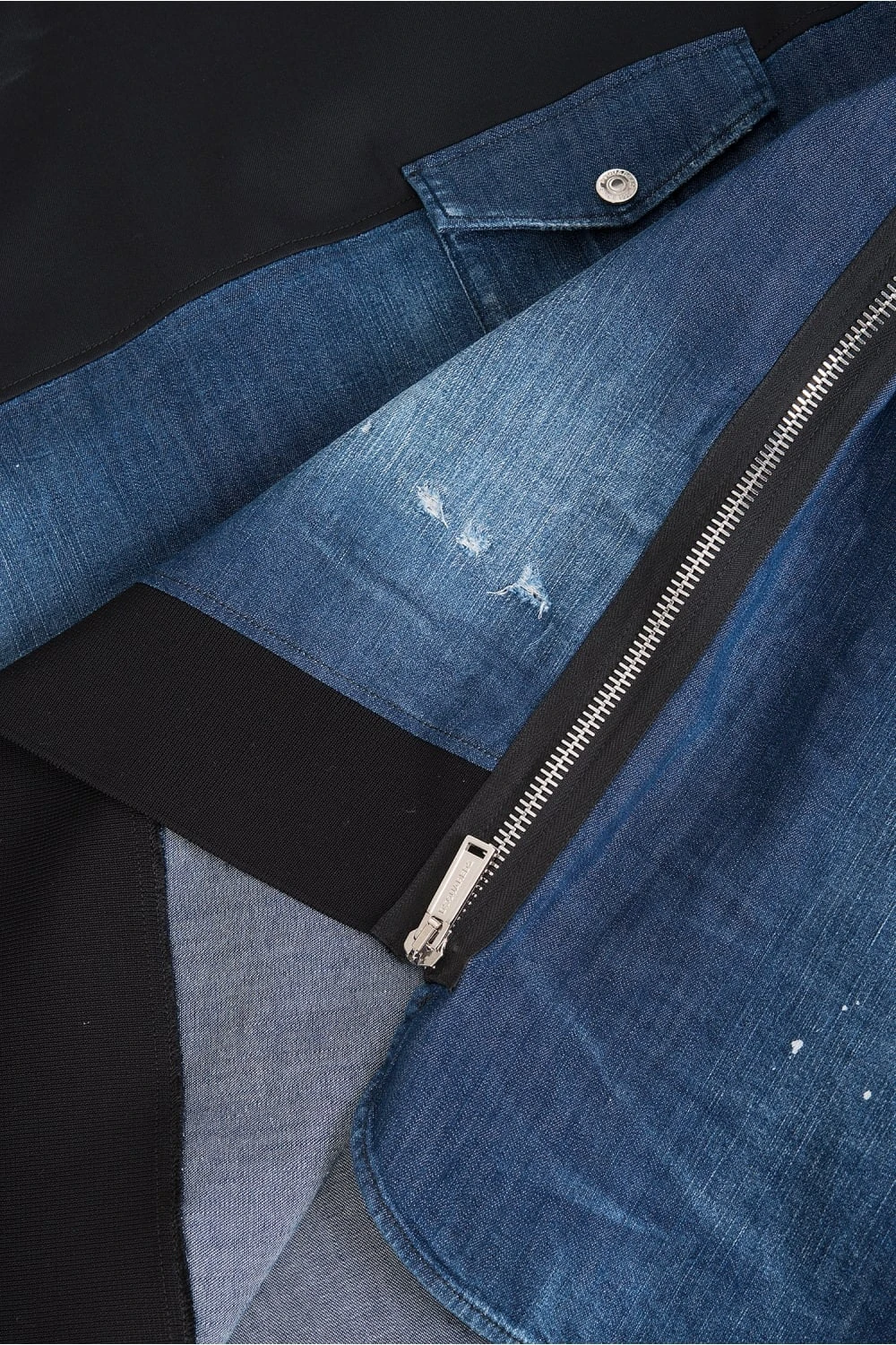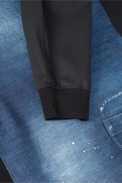 Featuring a front and back denim panel with paint splatter effects and a distressed look throughout. Finished with ribbed trims, zips along the seams and a chest pocket with a branded press stud fastening. Team with classic denim jeans and stylish sneakers to complete this statement look.Â