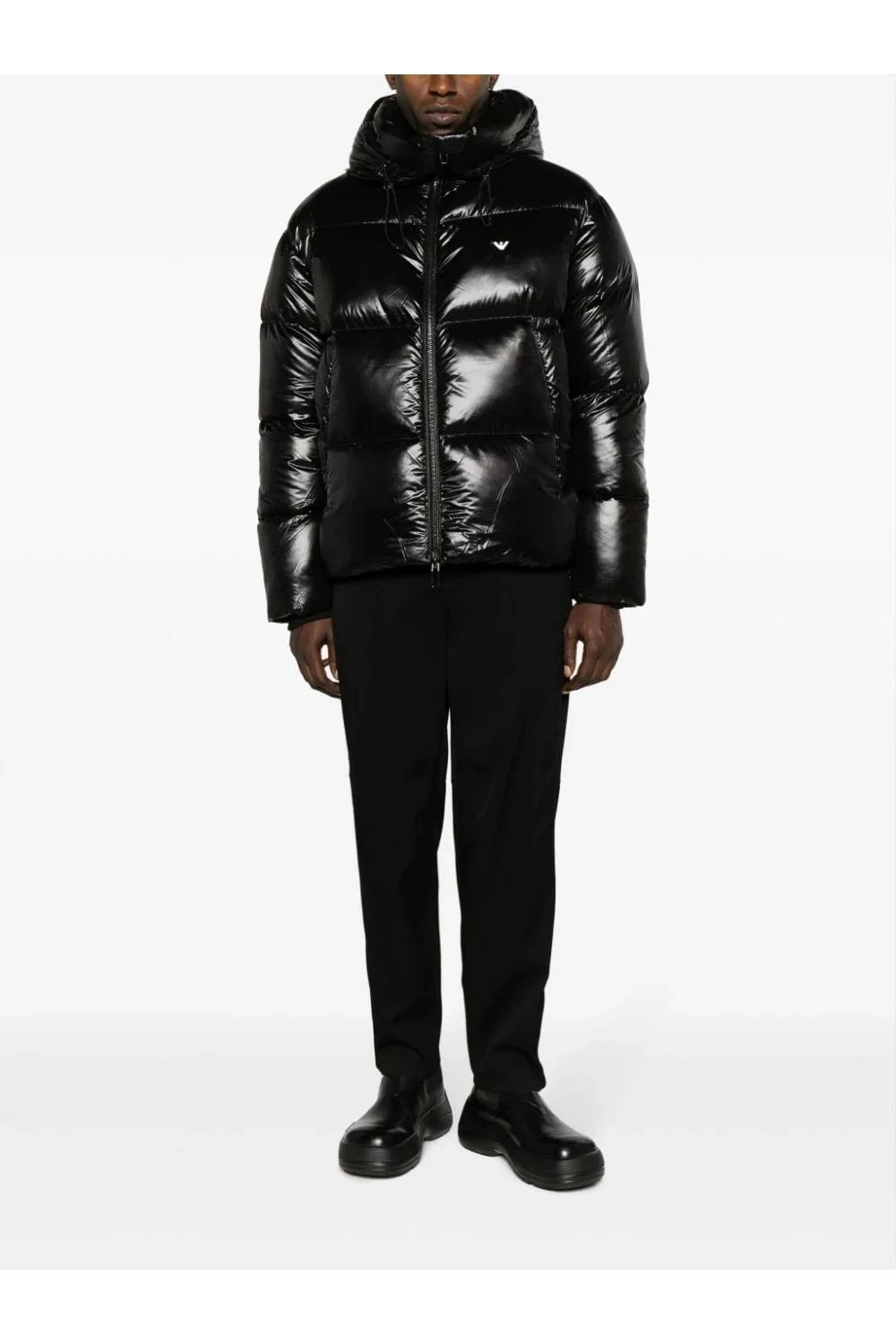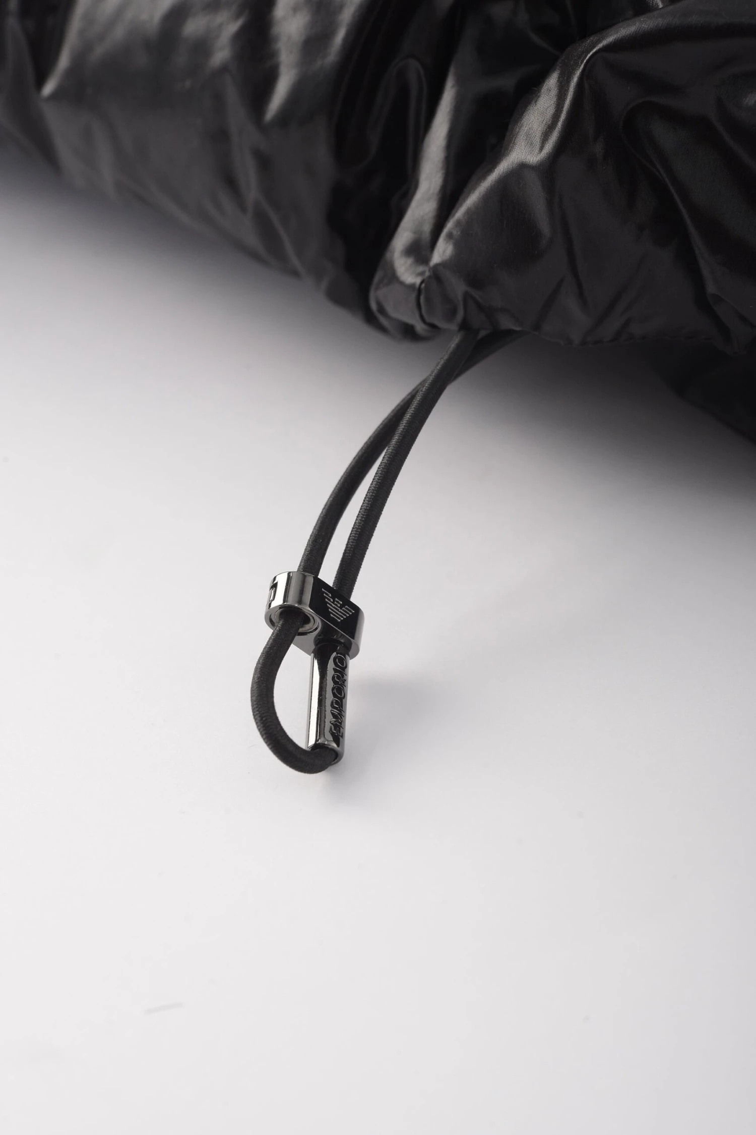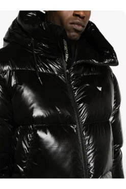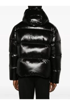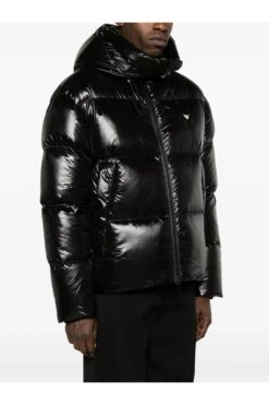 Down jacket with drawstring hood and zip fastening, made of horizontal-quilted nylon. The gatment is made of a lightweight polyamide fabric that gives a uniquely colour and feels soft. This creates a padded garment that gives a pleasant warm feeling whiel remaining light and comfortable when worn. The piece stands out for being water-repellent, ultra-lightweight and filled with genuine down padding. Finished off with the signature eagle