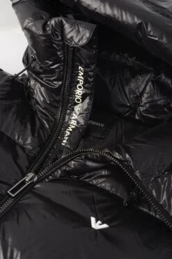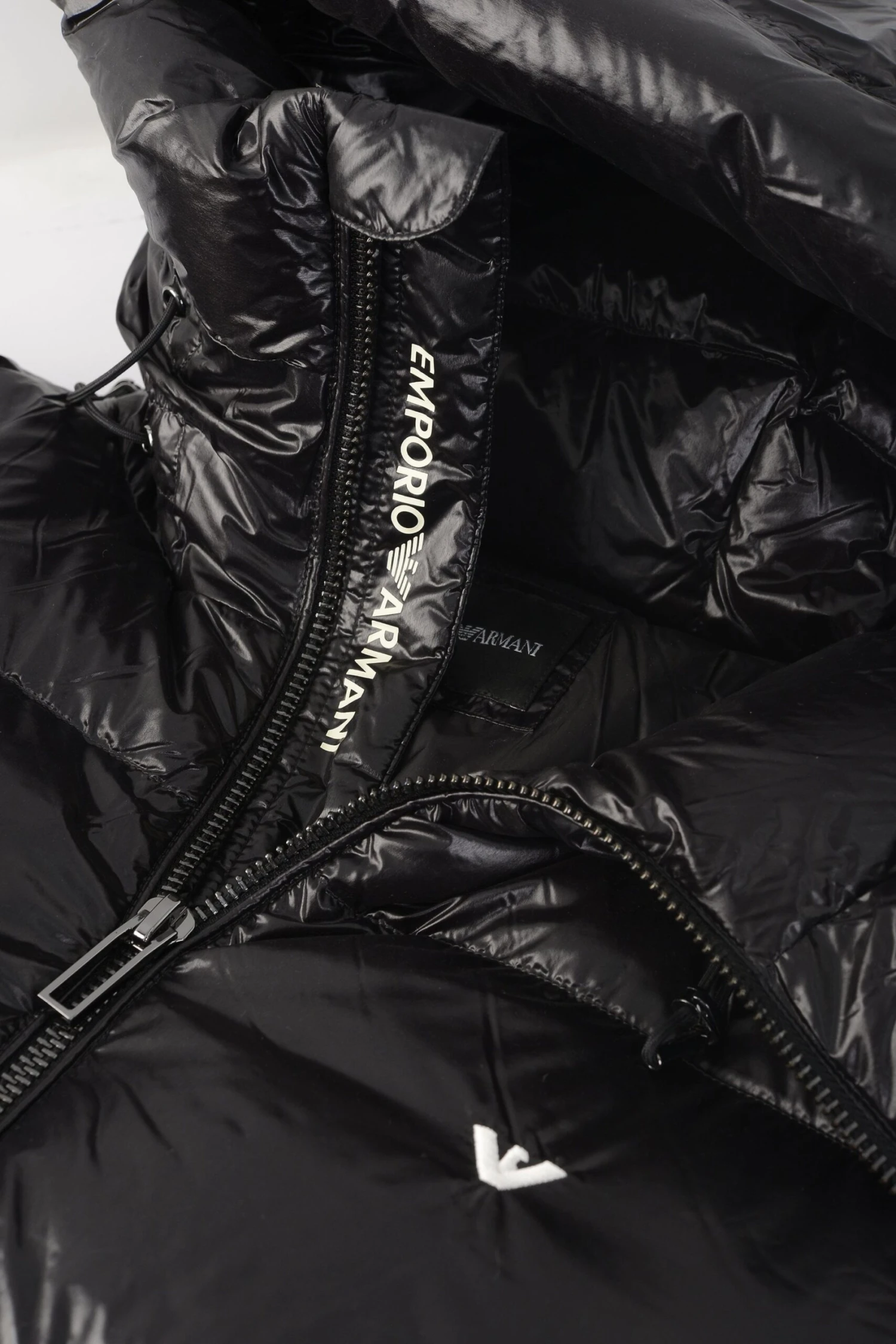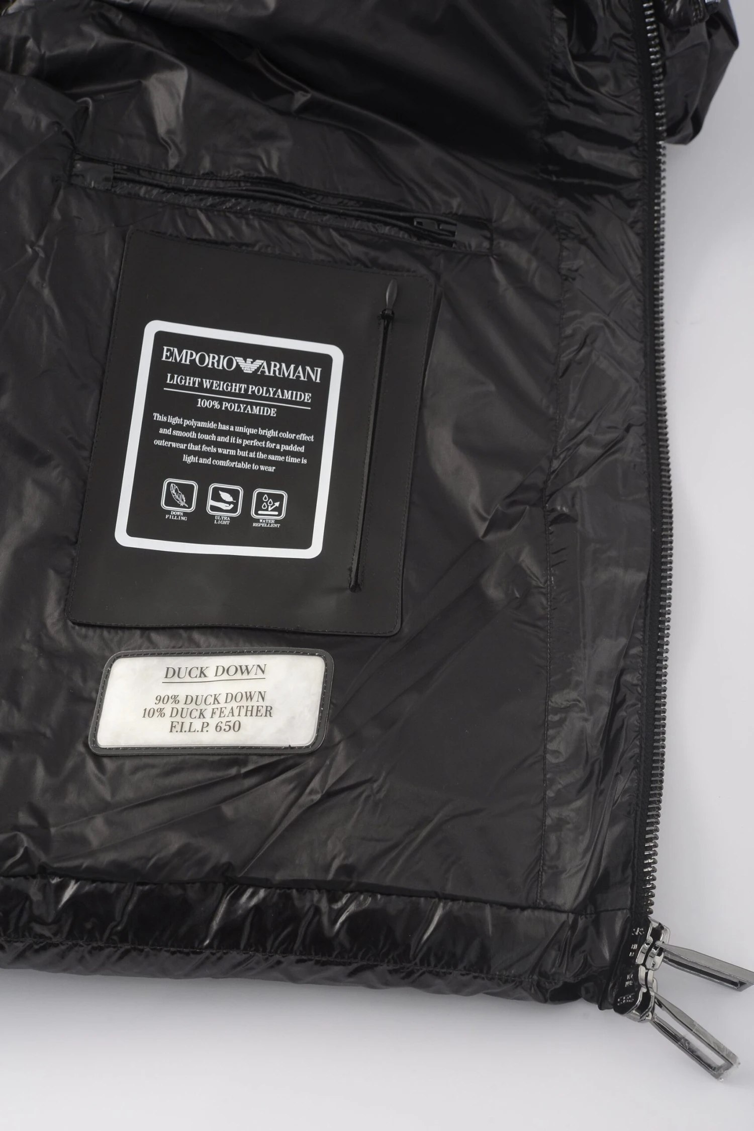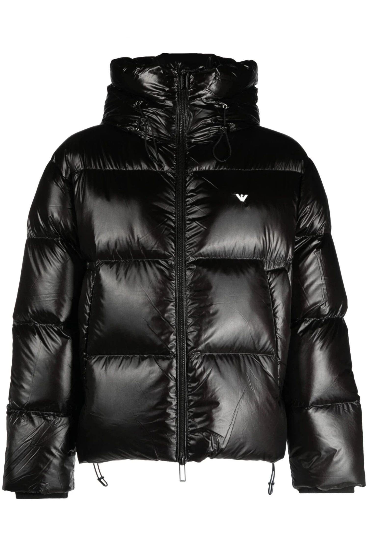 Down jacket with drawstring hood and zip fastening, made of horizontal-quilted nylon. The gatment is made of a lightweight polyamide fabric that gives a uniquely colour and feels soft. This creates a padded garment that gives a pleasant warm feeling whiel remaining light and comfortable when worn. The piece stands out for being water-repellent, ultra-lightweight and filled with genuine down padding. Finished off with the signature eagle