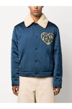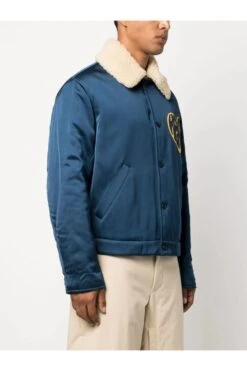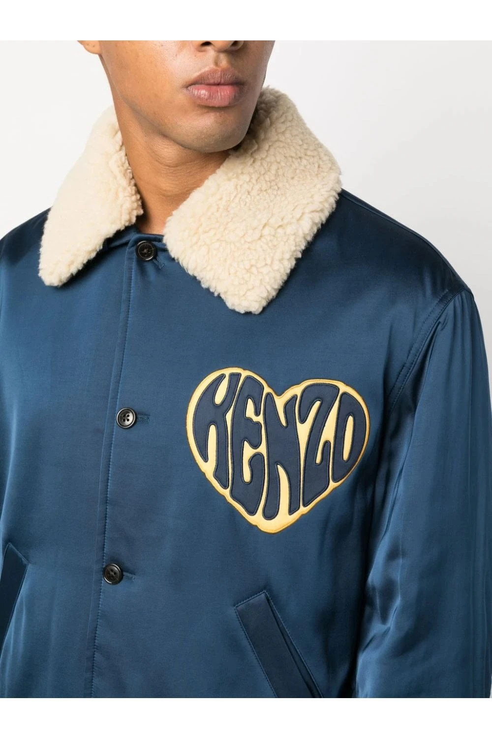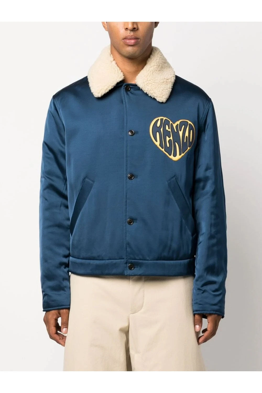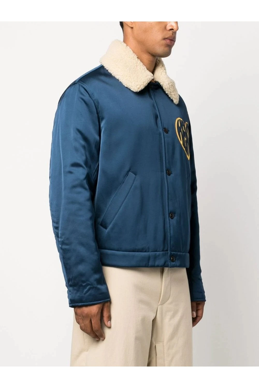 Heart- embroidery shearling collar jacket with oversized badges and removable collar