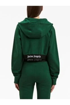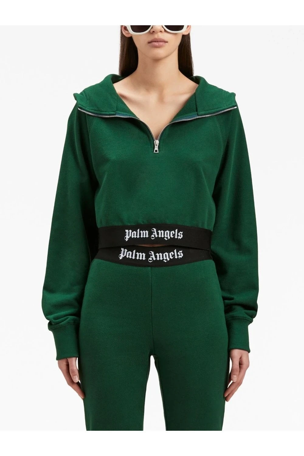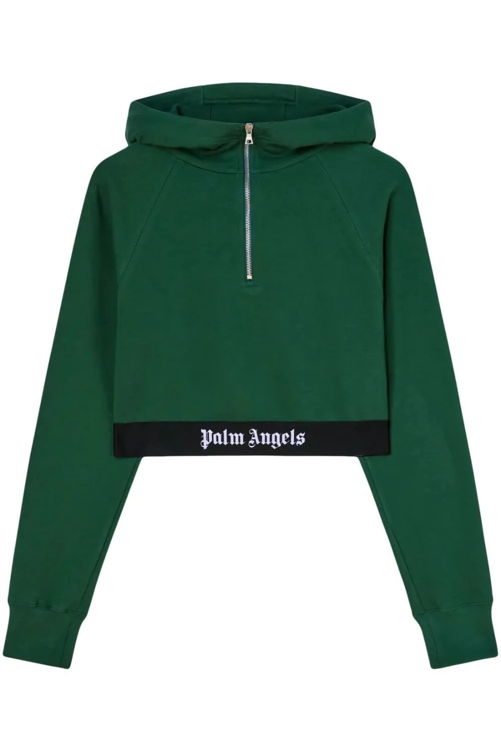 Embracing Palm Angel’s streetwear aesthetic, this cropped sweatshirt features a loose silhouette topped with a half zip and a fixed hood. The green backdrop gains contrast with a logo-strap hem