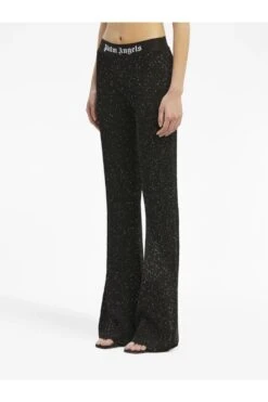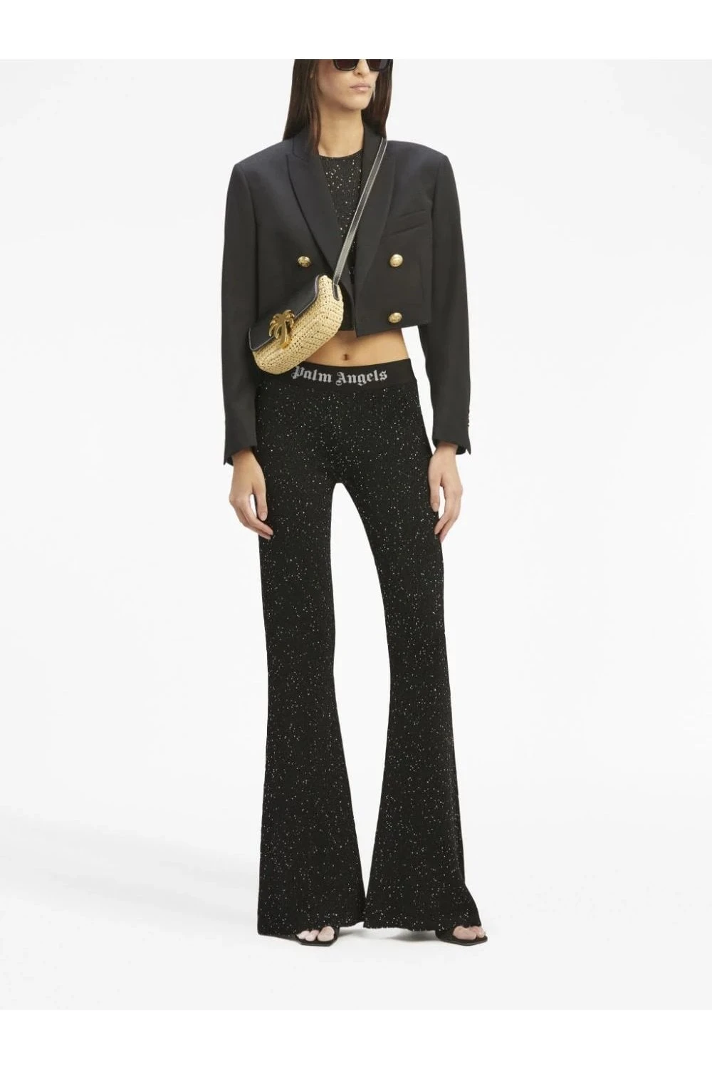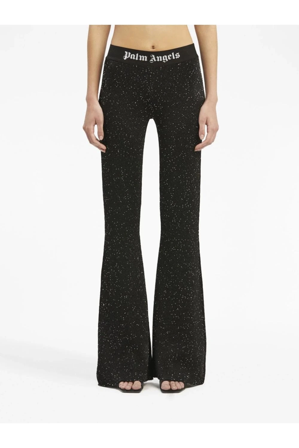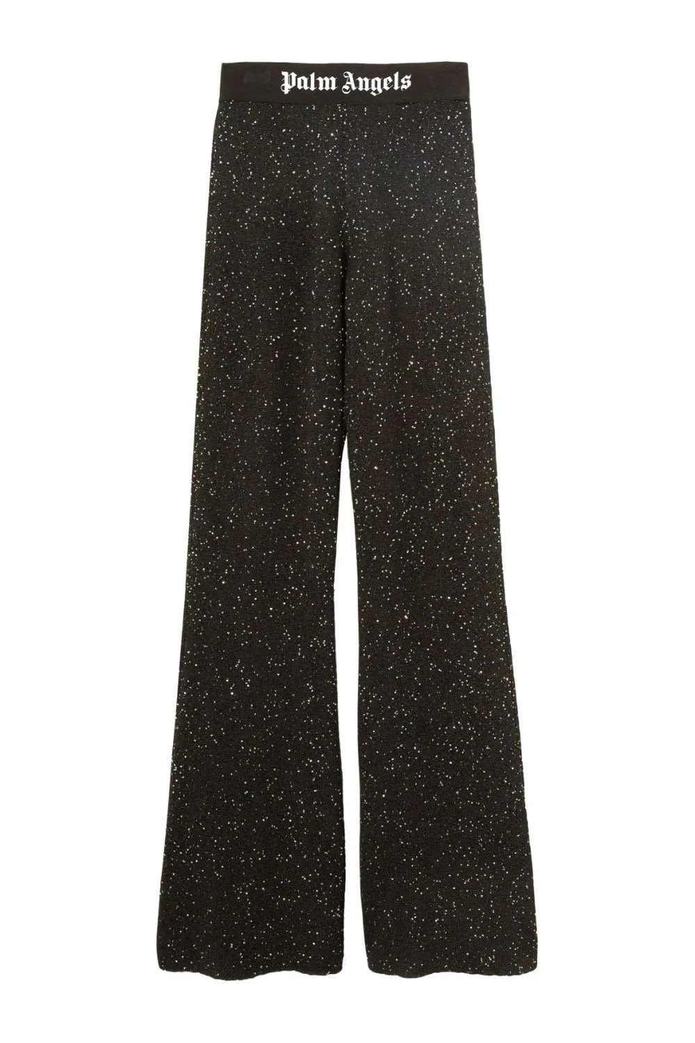 Presented in a black colourway with glittery detailing, these trousers from Palm Angels have been designed with comfort in mind with their elasticated logo-print waistband and flared legs.