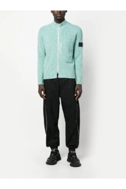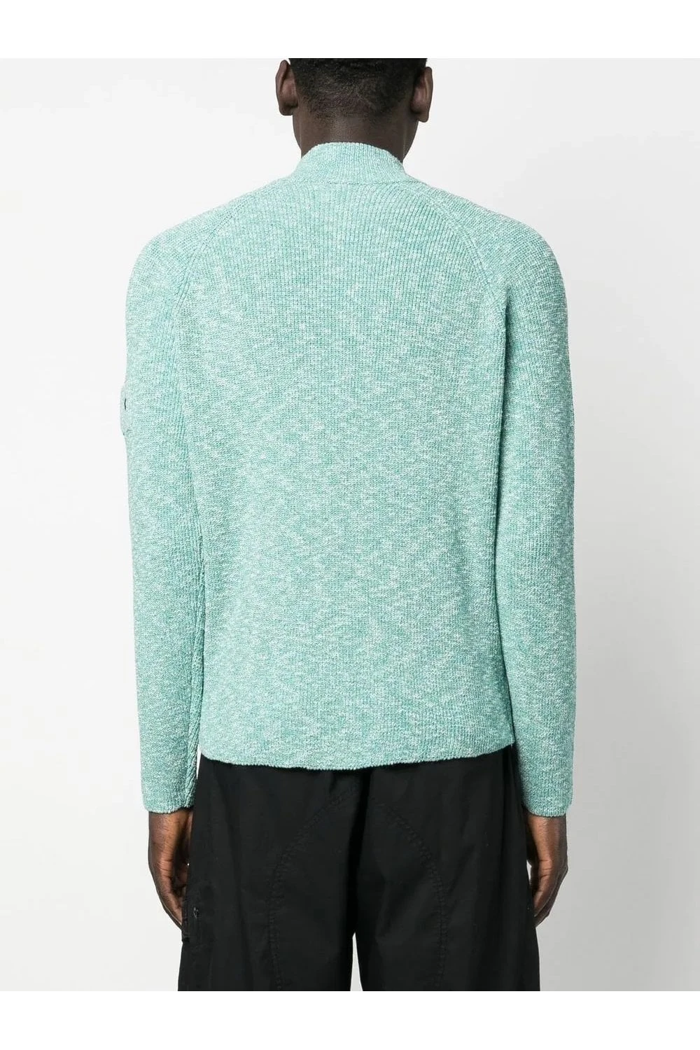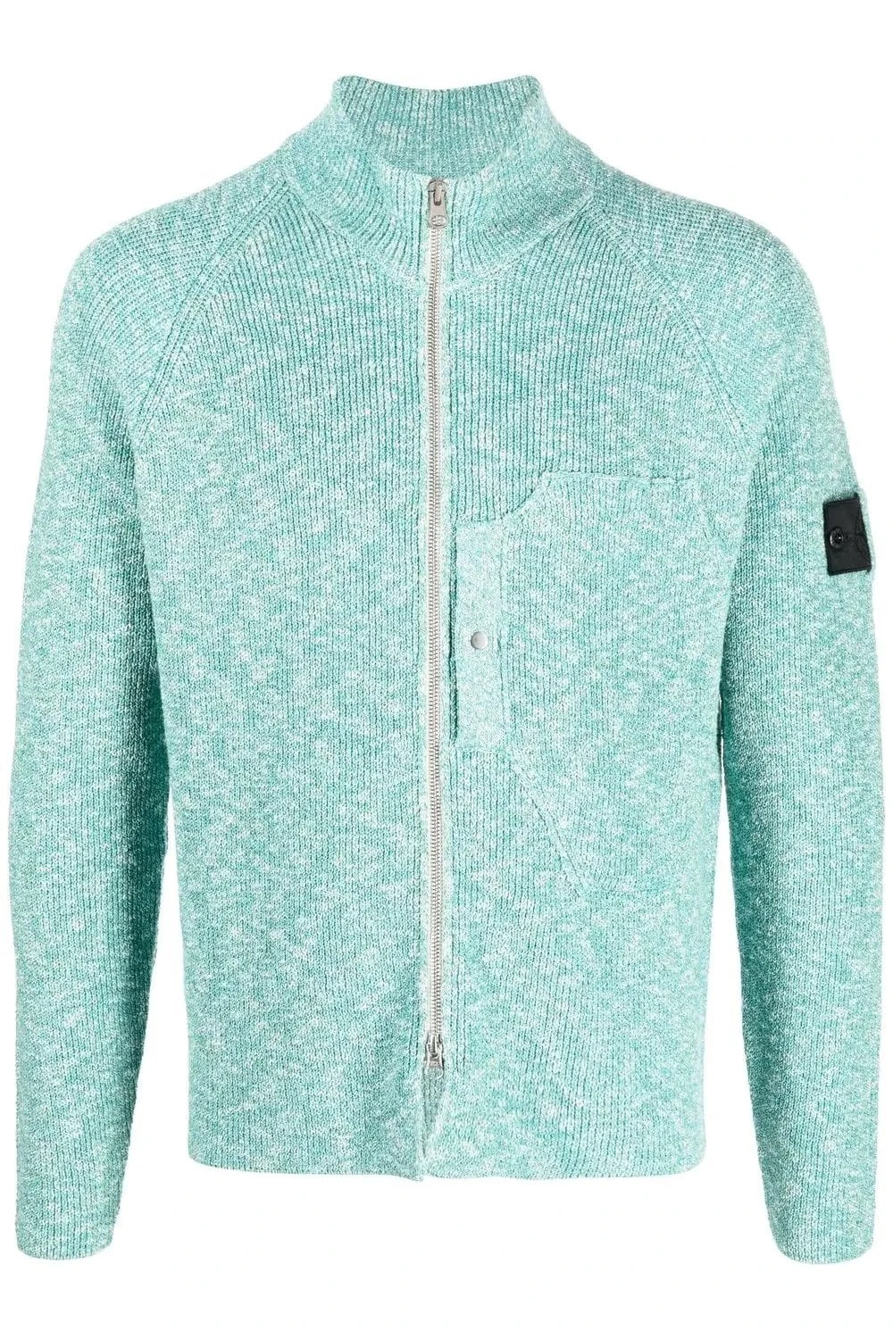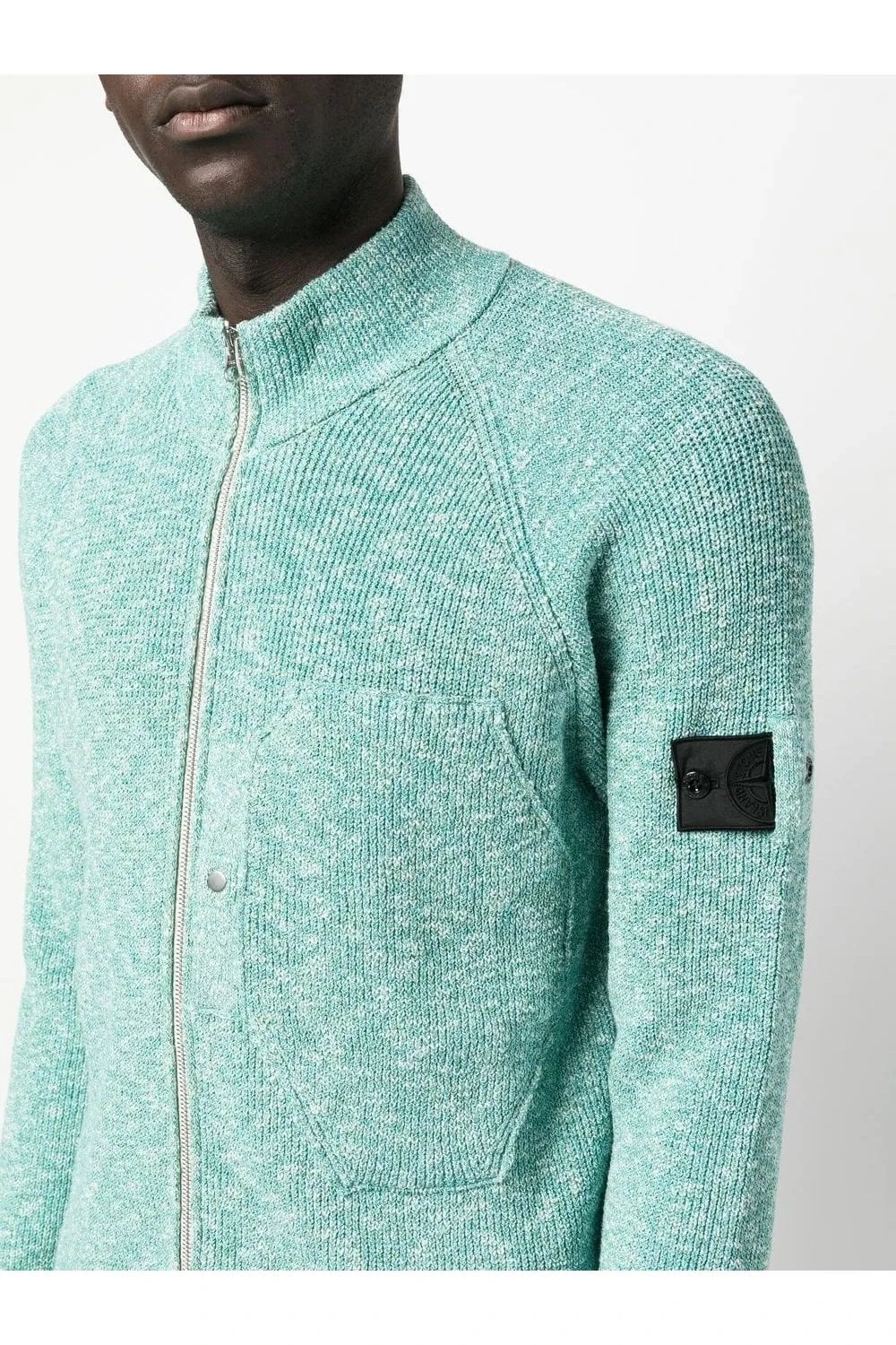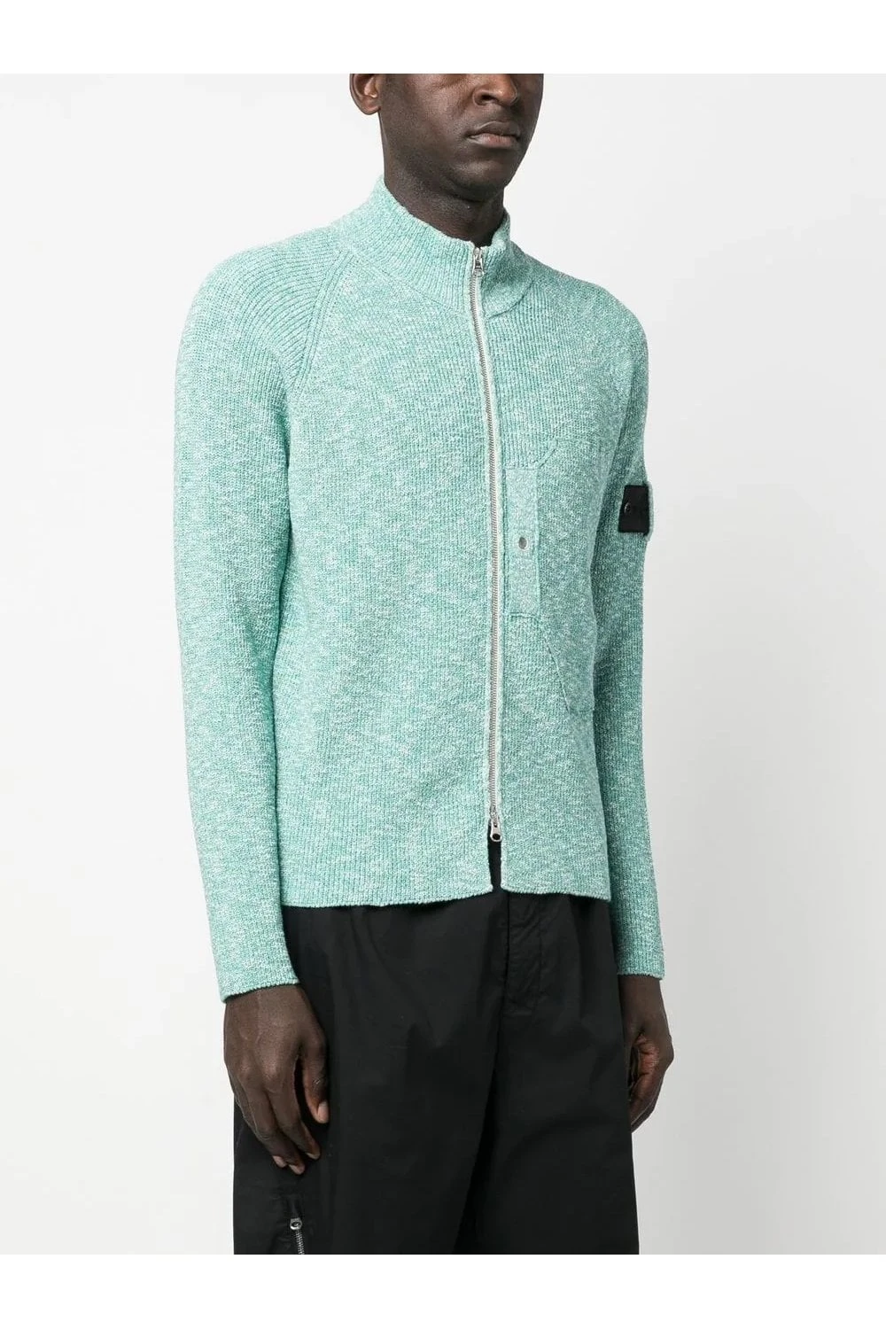 logo-patch zip-up cardigan from STONE ISLAND SHADOW PROJECT featuring turquoise blue-green, chunky knit, mélange effect, patch detail, signature Compass motif, frilled collar, front zip fastening and long sleeves.