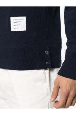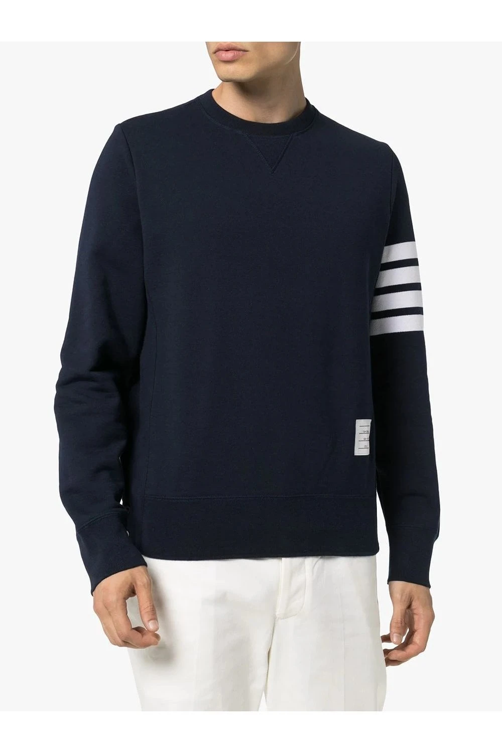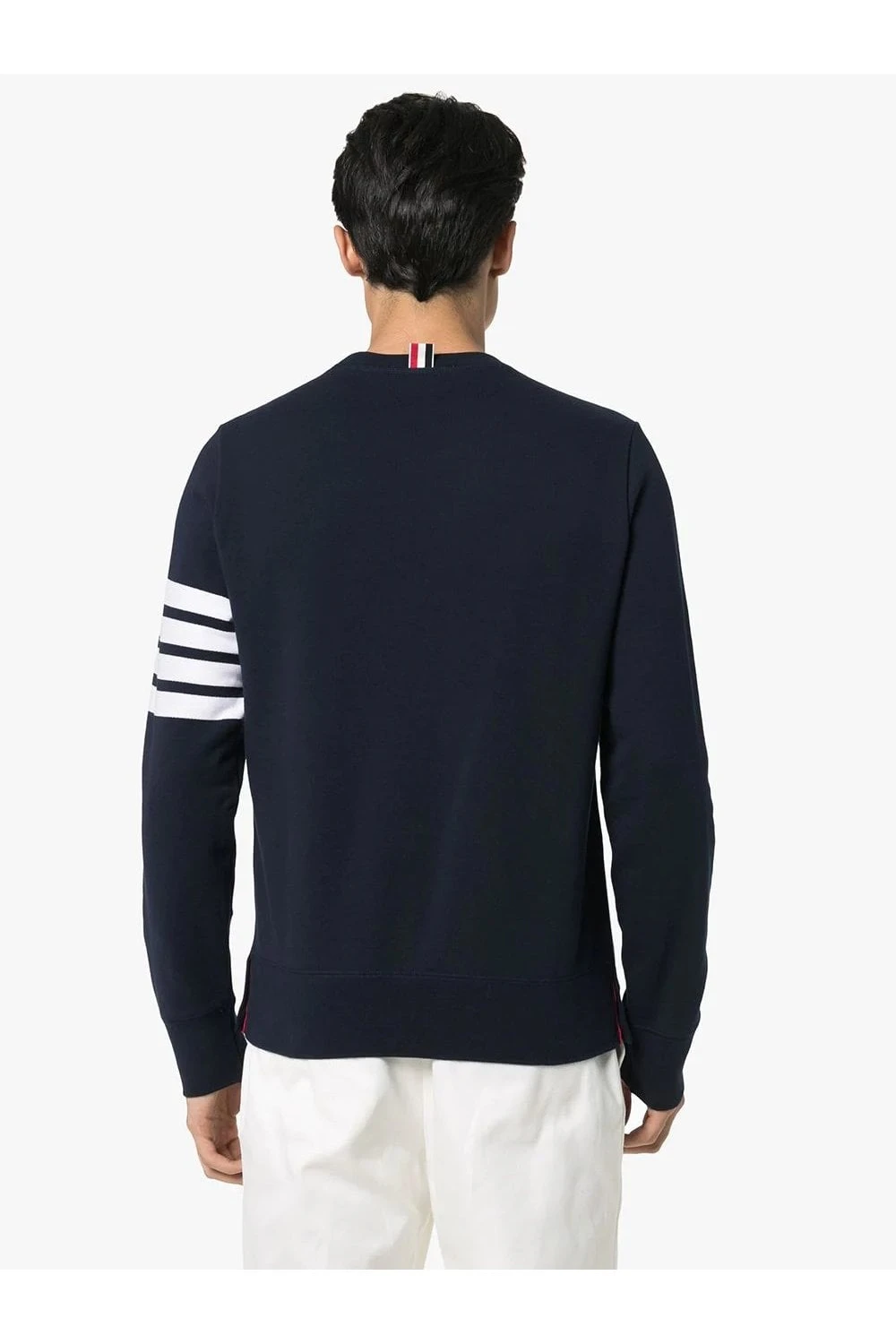 Navy blue Made from brushed loopback cotton jersey Crew neck with V insert Long sleeves 4-Bar stripe at left arm Name tag appliqué at left side Tricolour grosgrain loop at nape Ribbed trims Straight hem Relaxed fit Crafted in Japan