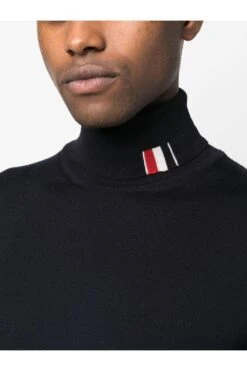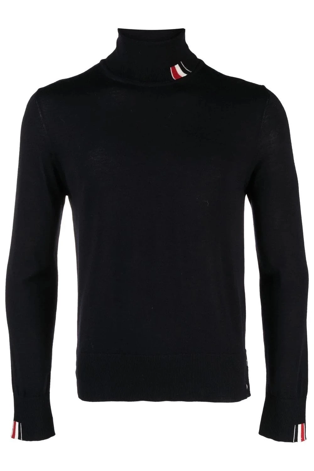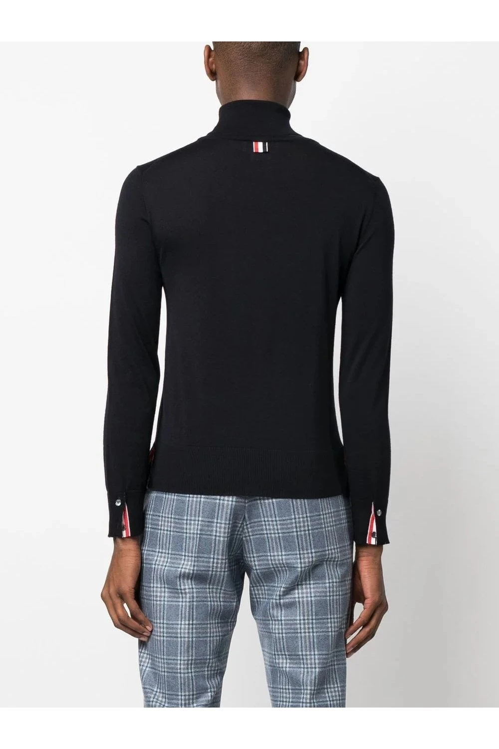A classic staple piece from THOM BROWNE this fine-knit turtleneck features a roll neck, long sleeves and straight hem. Finished off with the RBW stripe on the front of the neckline, rear and cuffs