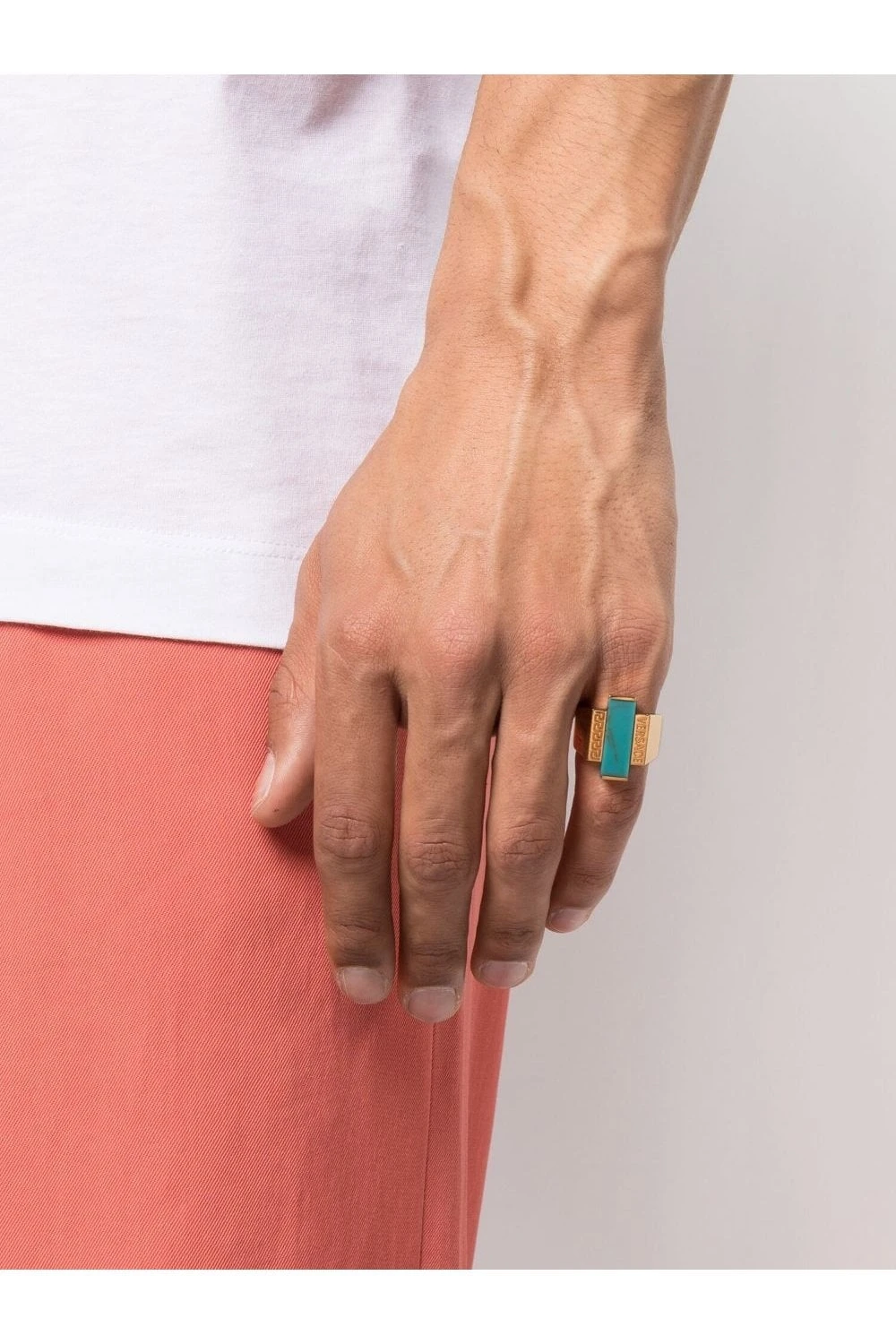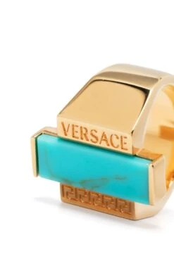 Adorned with a turquoise stone, this ring from Versace is crafted from polished gold-tone brass. Designed with a chunky band, the piece is finished with signature Greca detailing and an engraved logo.