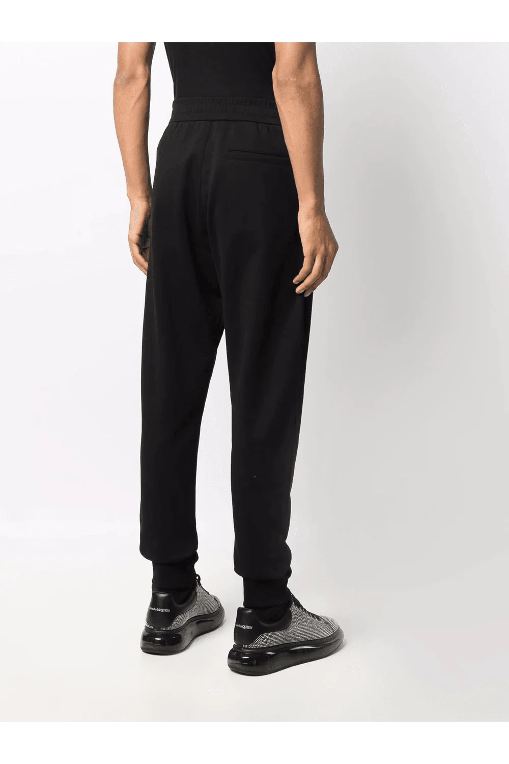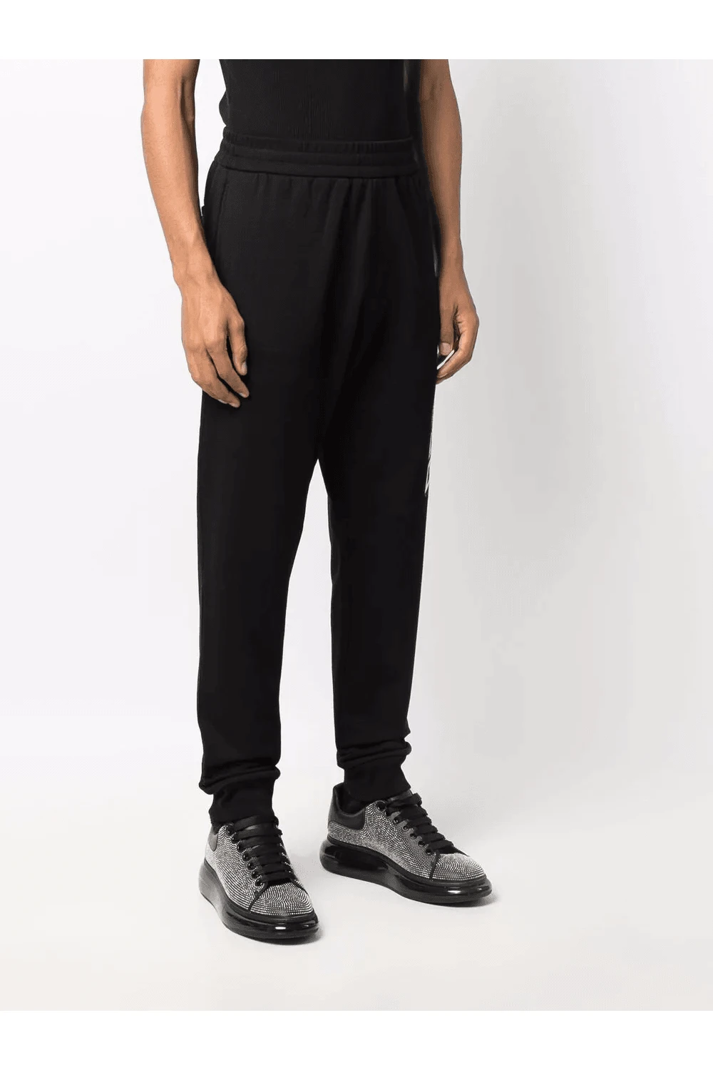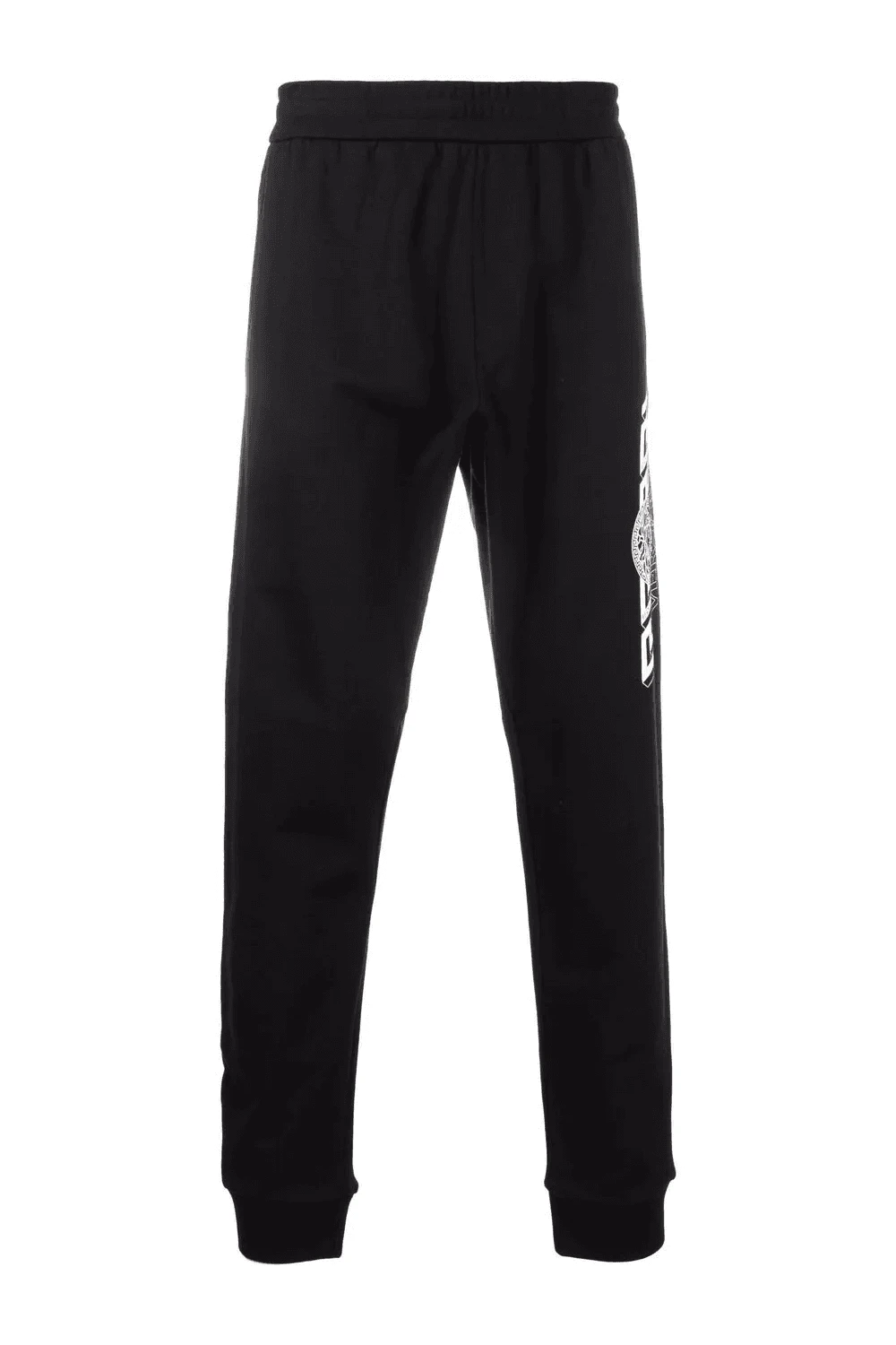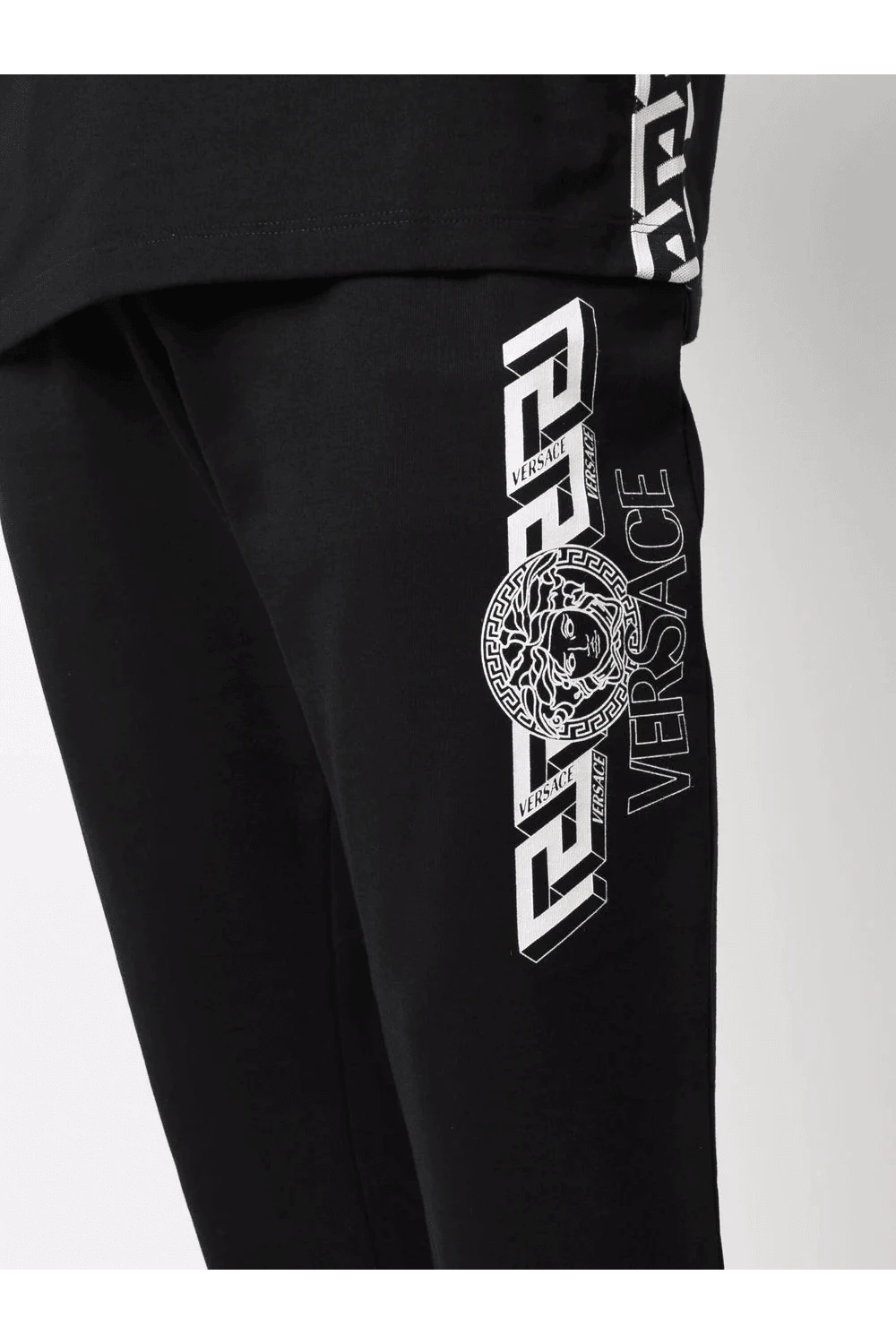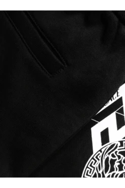 Versace’s track pants feature two iconic brand signatures. Notice the white Medusa Head motif and Greca detailing that contrasts against the black background.