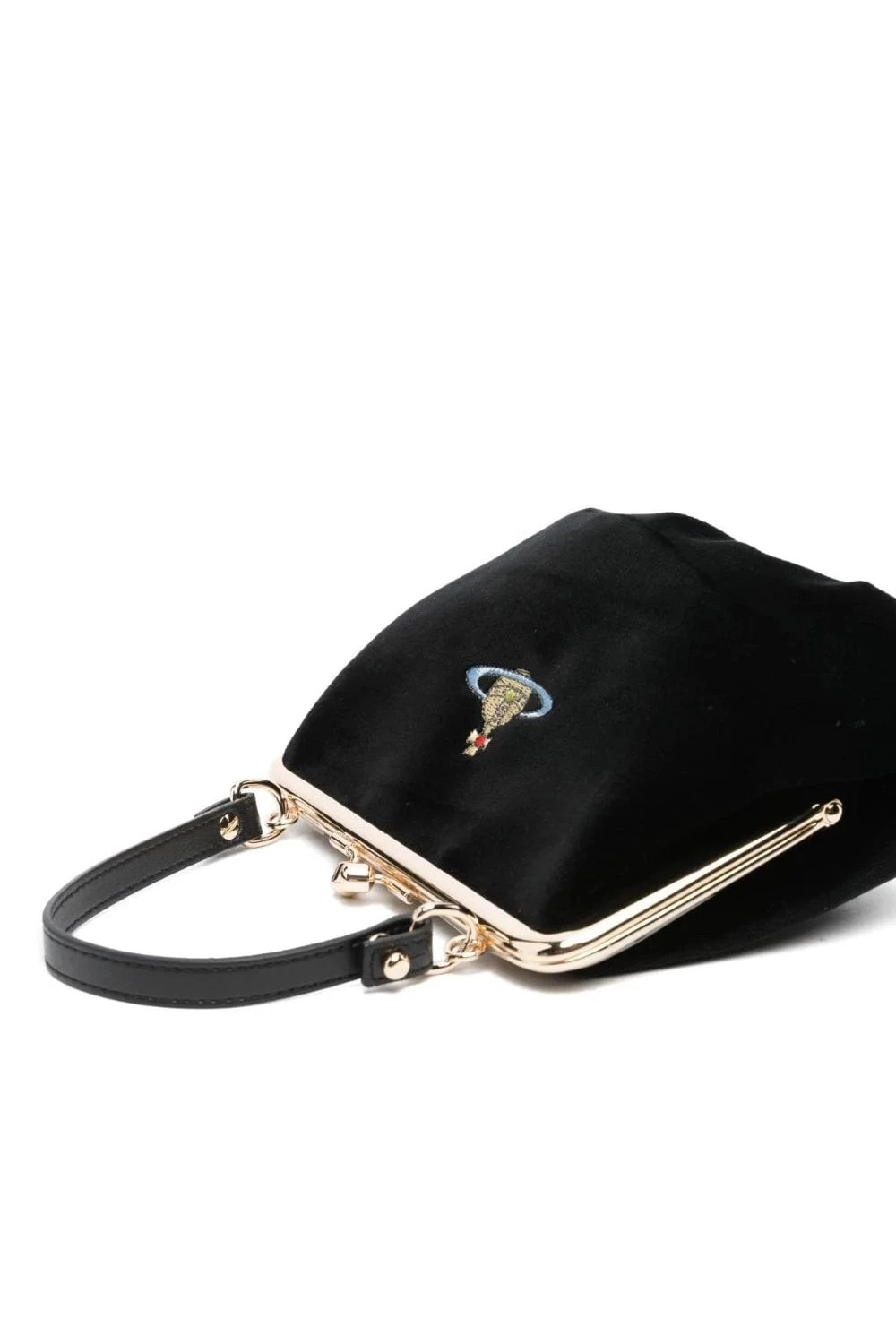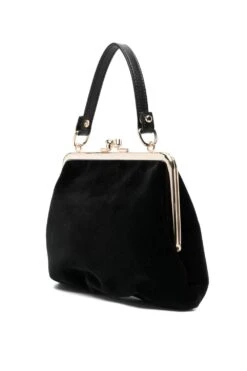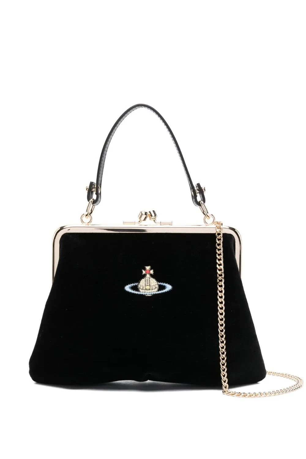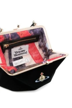 Modelled after Victoria styles, this Vivienne Westwood Granny Frame bag is made from plush black velvet and embroidered with an iconic Orb at the front – a motif that combines astronomical symbollism with British regalia in a nod to the past and future