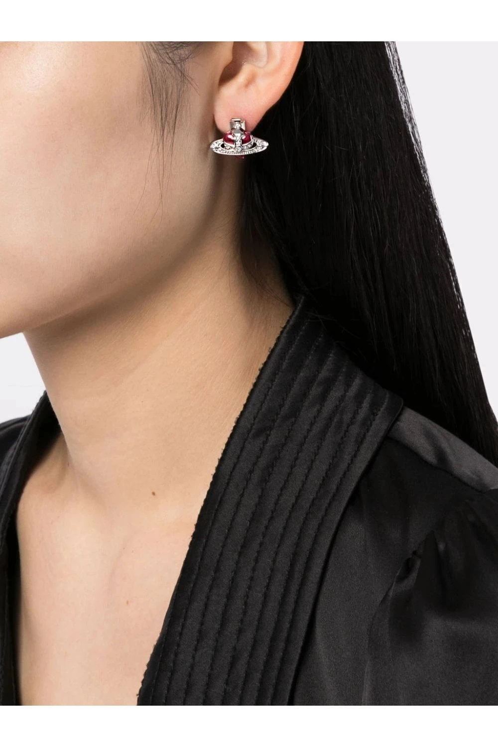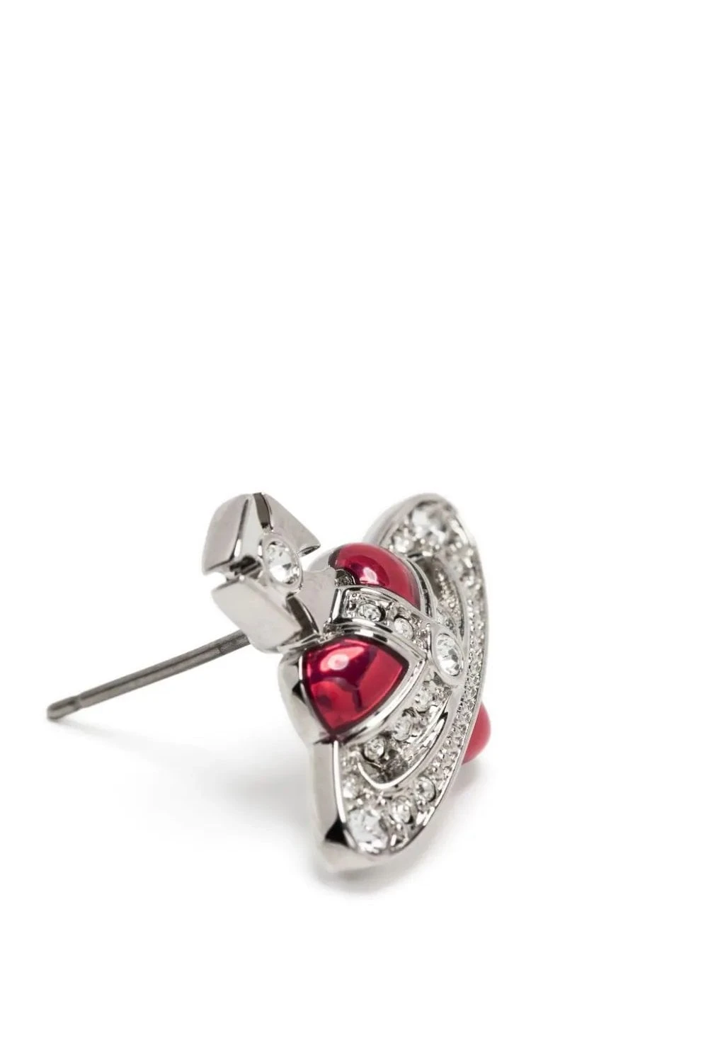 These silver-tone Vivienne Westwood earrings are cast into the shape of the maison’s New Diamante Heart motif, an asymmetric symbol incorporating elements from the brand’s iconic Orb emblem. They are encrusted with white crystals and hand-painted with translucent pink enamel