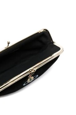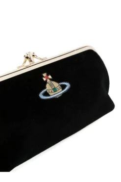 Modelled after Victoria styles, this Vivienne Westwood Kiss-lock wallet is made from plush black velvet and embroidered with an iconic Orb at the front – a motif that combines astronomical symbollism with British regalia in a nod to the past and future